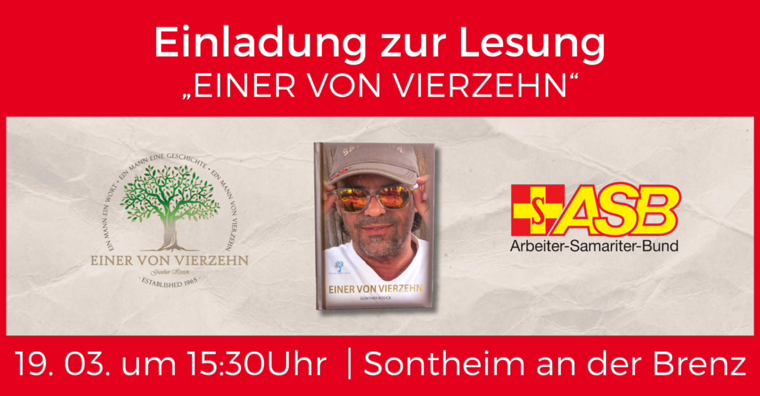 Der Arbeiter-Samariter-Bund (ASB) in Sontheim an der Brenz hat Günther Kosick für eine Lesung seines Buchs mit dem Titel „EINER VON VIERZEHN“ eingeladen. Am 19.03.2020 um 15:30 Uhr erwartet Sie ein spannender Nachmittag. Herrlich offen vom Autor Günther Kosick selbst erzählt, finden Sie sich plötzlich mitten unter vierzehn Geschwistern, fühlen mit, wenn es um geteilte Wannenbäder oder „Truppeneinkäufe“ beim Bäcker geht. Mal frech und verrückt, mal nachdenklich und traurig – aber immer sich selbst treu.